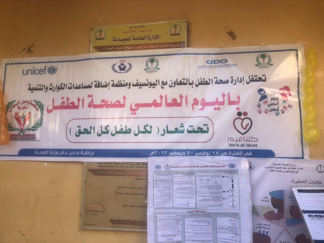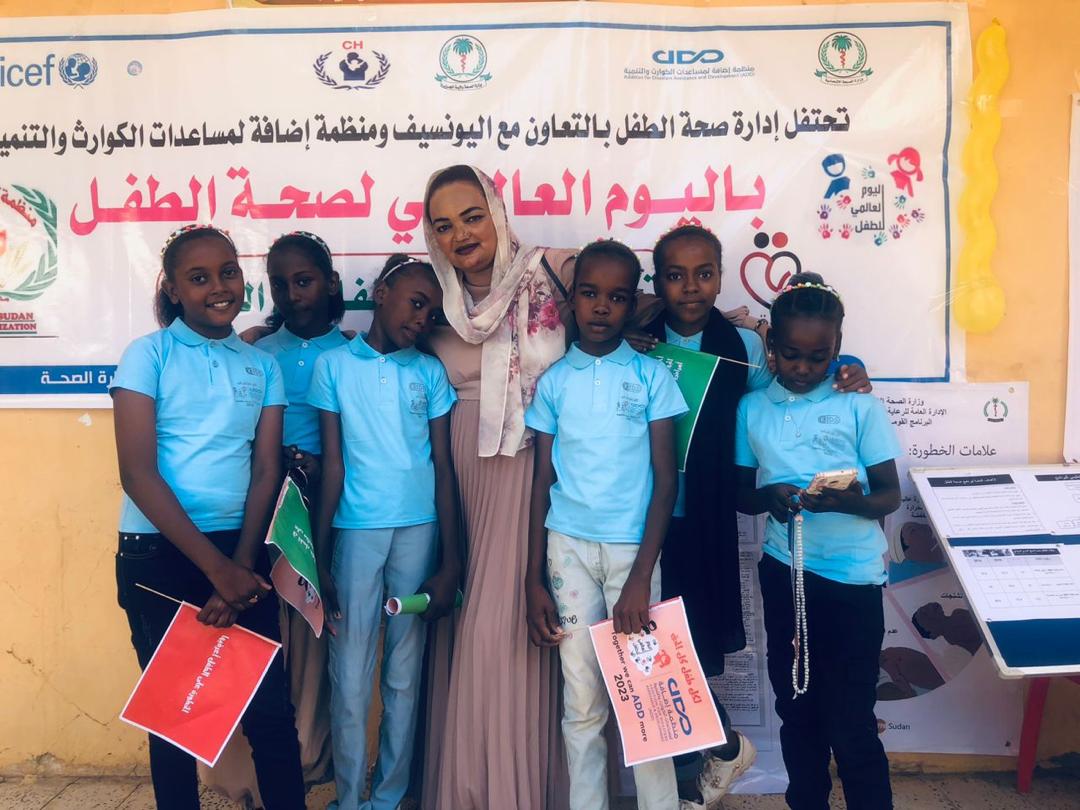 قامت منظمة اضافة لمساعدات الكوارث والتنمية بالمشاركة مع كلنا قيم وتواصل والجمعية العلمية والعديد من القطاعات ذات الصلة بتدشين الأسبوع الوطني لصحة الطفل بوزارة الصحة تحت شعار (لكل طفل كل الحق) بمركز الايواء مركز الشهيد اركويت 28 بمدينة ود مدني وضم الإحتفال محاضرات تثقيفية لرفع الوعي لصحة الطفل والأم بالإضافة للتثقيف عن الكوليرا. ومسرحيات واناشيد ورسومات من أطفال المعسكر كما شمل الإسبوع العيادة المتجولة لمعالجة الأطفال وتم مسح تغذوي وجلسات إرشادية للمرضعين وللنساء الحوامل كما استهدف الأسبوع الجانب العلاجي والوقاية ورفع الوعي الصحي